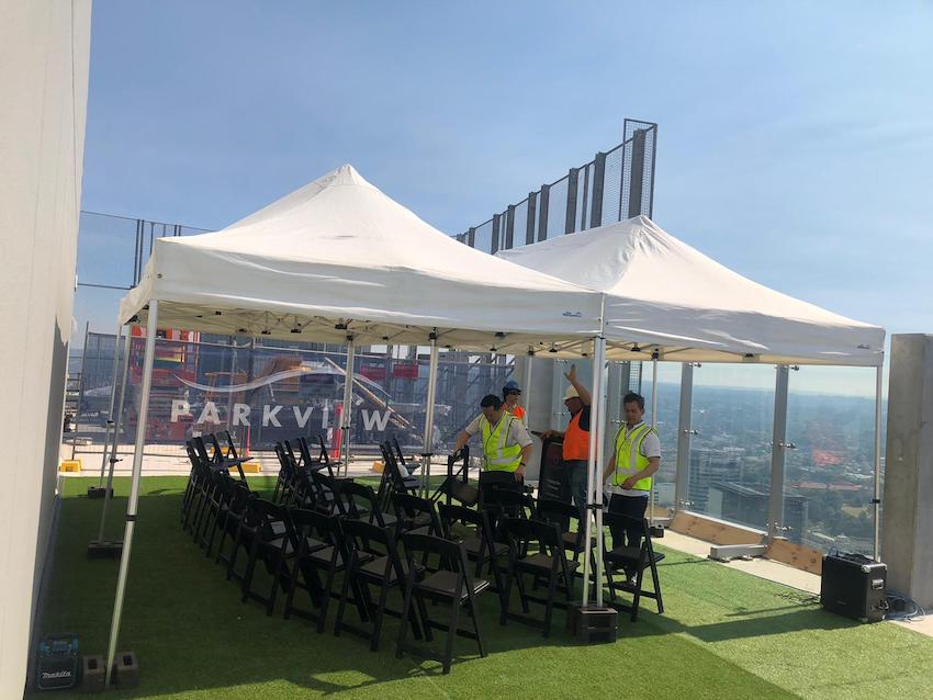 Our Pop-up Marquee hire features a sturdy steel frame that is incredibly easy to set up. The white roof of the marquee will provide shade and protection from the weather.
