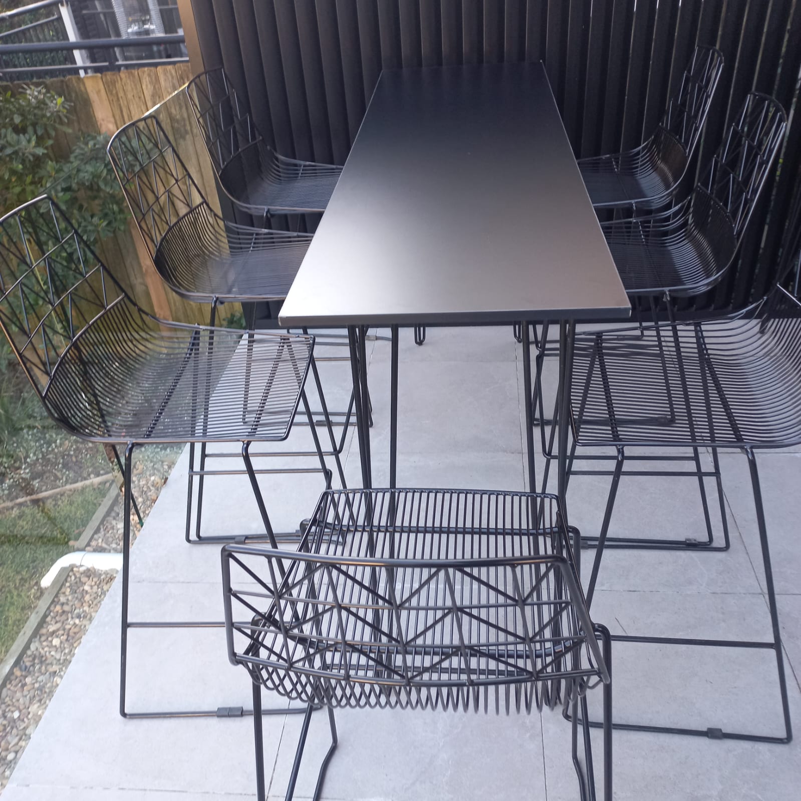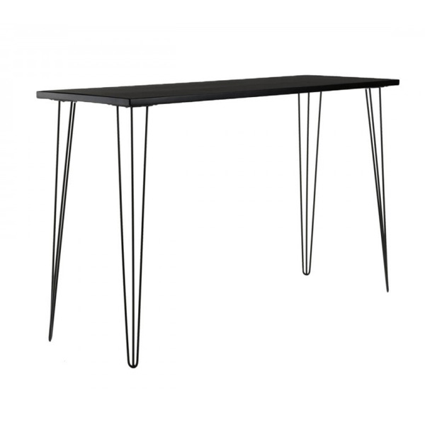 Our black hairpin high bar table hire has dimensions of 110cm height and 1.8m long and can seat approx. 6-8 stools around the table, they are ideal for cocktail events or for serving food and drinks for your guests to self serve.