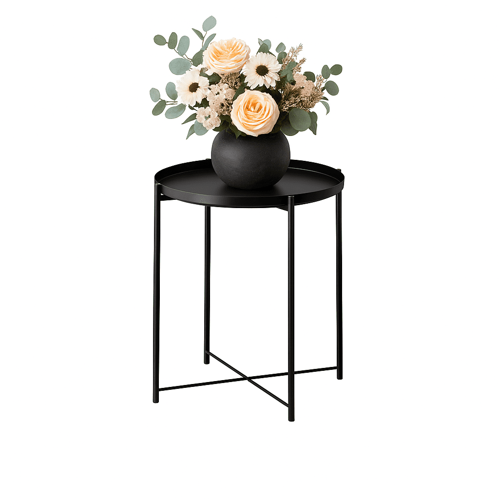 Add a modern, sleek touch to your Sydney event with the Black Metal Tray Side Table from Event Hire Co. This table features a minimalist, all-black design perfect for cocktail lounges, corporate areas, or any function needing a contemporary edge. Its round top includes a crucial raised tray edge, ensuring drinks and small items stay secure and stable—a must-have for busy events. Durable and stylish, this side table is the practical and polished choice to complete your seating areas.