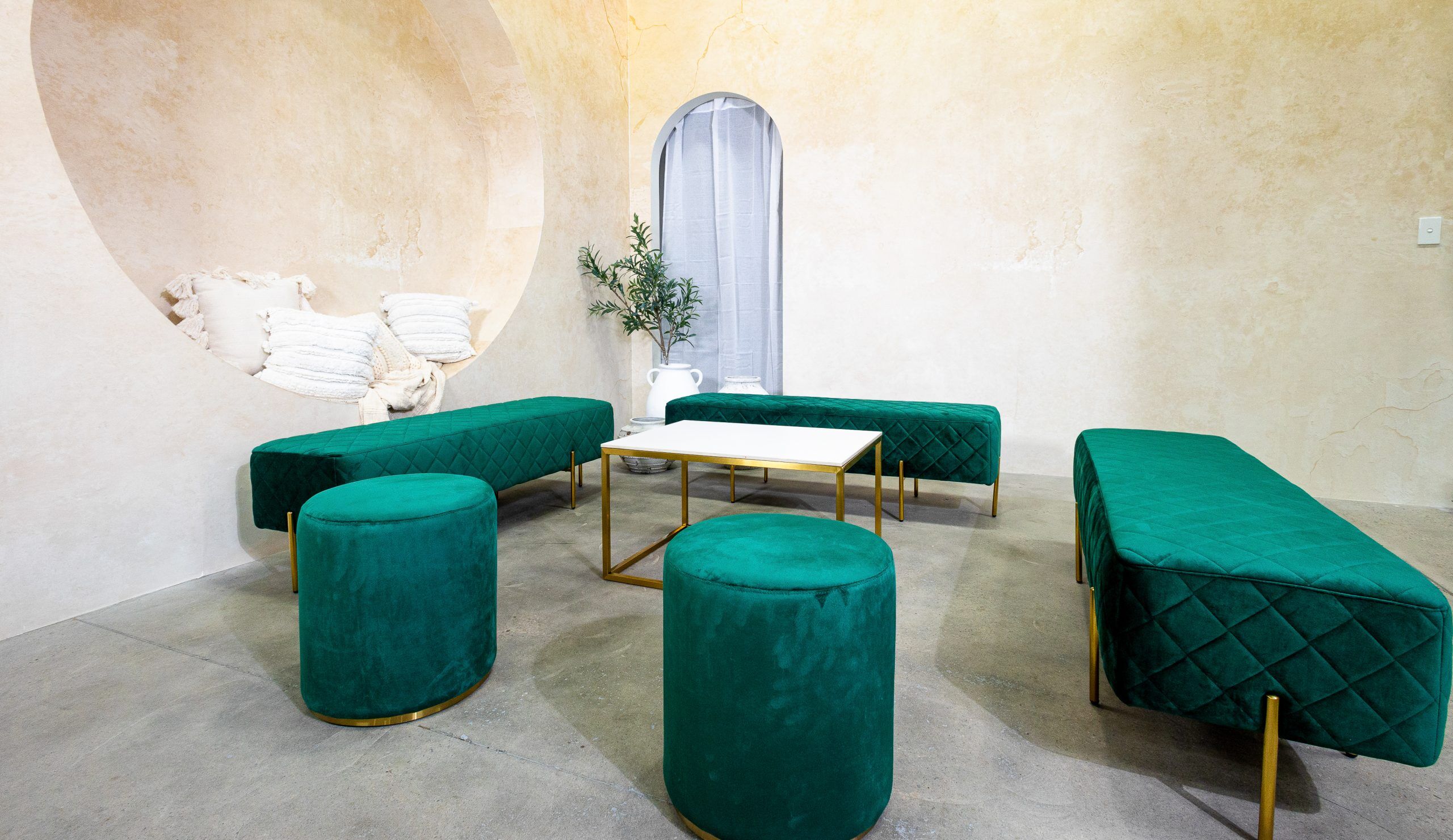 Our emerald green velvet ottoman stool hire is the perfect addition to add to your lounge seating for your next event. This emerald green velvet ottoman is subtle yet elegant made crafted with a soft velvet material in a deep emerald green colour with an elegant gold stainless steel trim.
