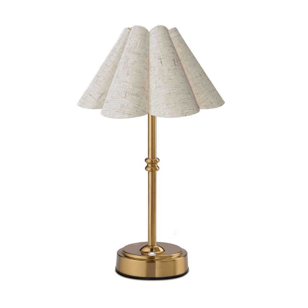 Elevate your events with the refined and timeless beauty of this rechargeable table lamp. Its gold base and beige linen scalloped shade add a touch of sophistication to any wedding, christening, baby shower, or intimate gathering. The cordless design ensures easy and elegant placement anywhere, while three touch-controlled brightness settings allow you to effortlessly create the perfect ambiance. This versatile piece blends classic charm with modern convenience to enhance any occasion and create a warm, inviting atmosphere.
