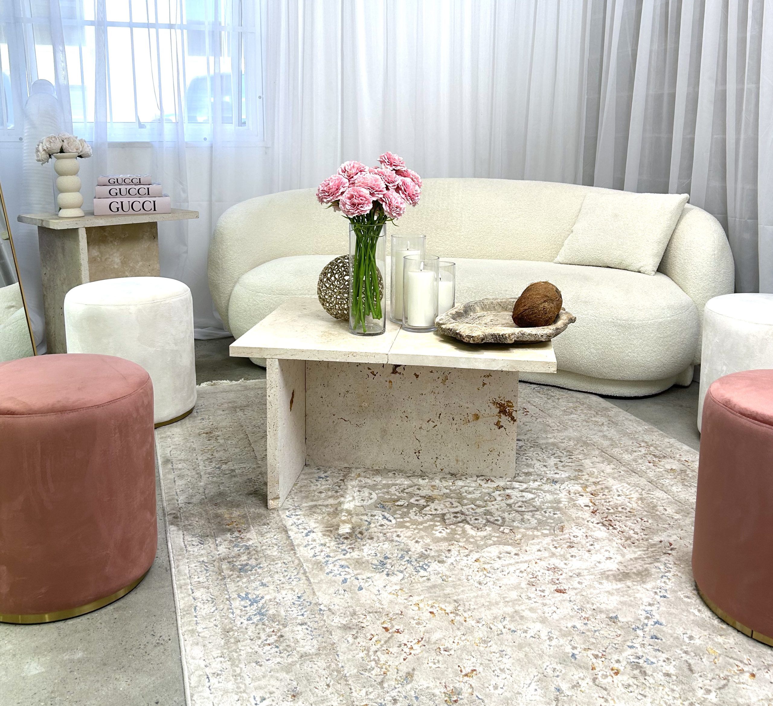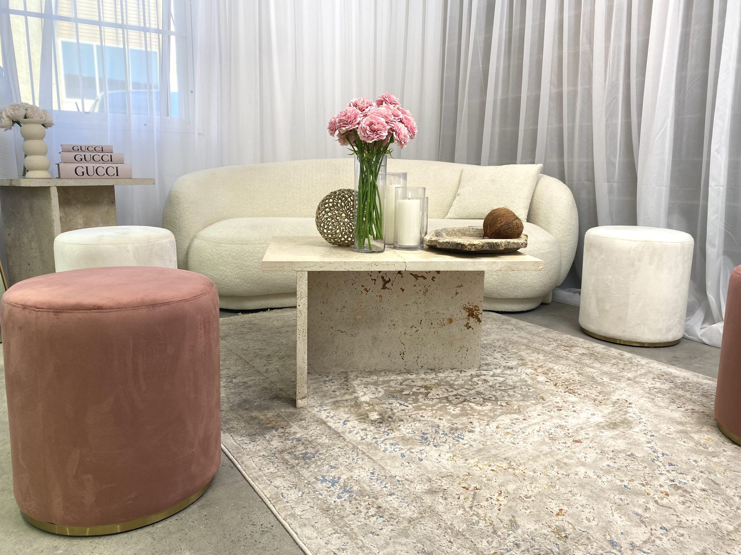 Our pink velvet ottoman stool hire is the perfect addition to add to your lounge seating for your next event. This pink velvet ottoman is subtle yet elegant made crafted with a soft velvet material in a soft pink colour with an elegant gold stainless steel trim.