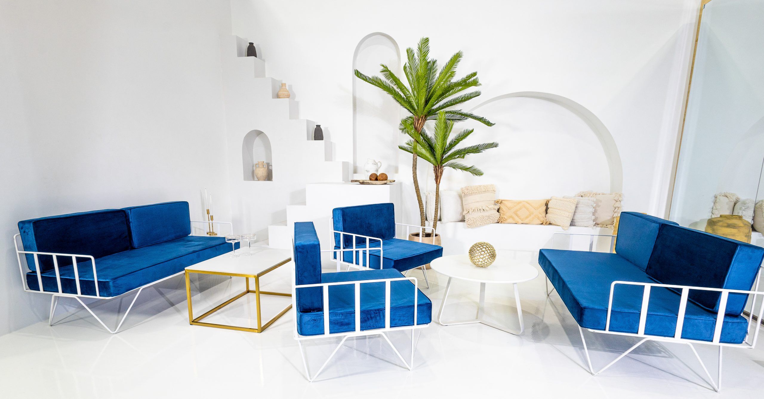 Our wire arm chair is the perfect seating addition to your upcoming function. With its clean lines and minimalist design crafted with a white iron frame and luxurious deep navy blue seat and back cushions adding a modern touch to your event space.